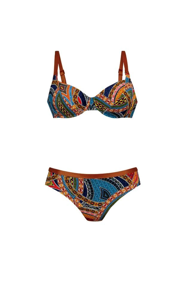 Inspiré des fabuleuses couleurs de l’Afrique, ce bikini à armatures Rubina attire l’attention avec son imprimé expressif. Des couleurs d’épices exceptionnelles, des tons bleus brillants, sans oublier de fins ornements métalliques sur les bretelles le rendent tout à fait accrocheur. L’ensemble de la gamme » Ethno Vibrations » est complété par un bas de bikini mi-haut qui ne cisaille pas grâce à une ceinture douce.