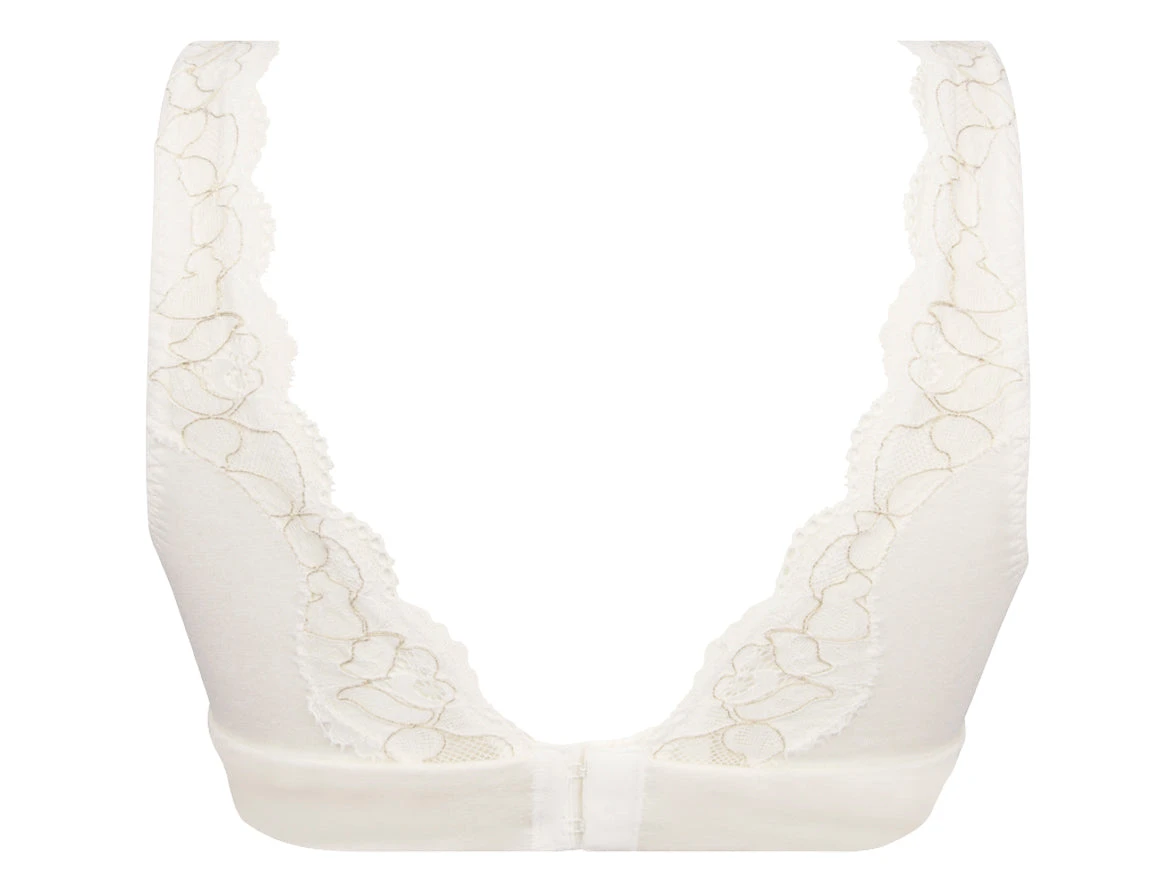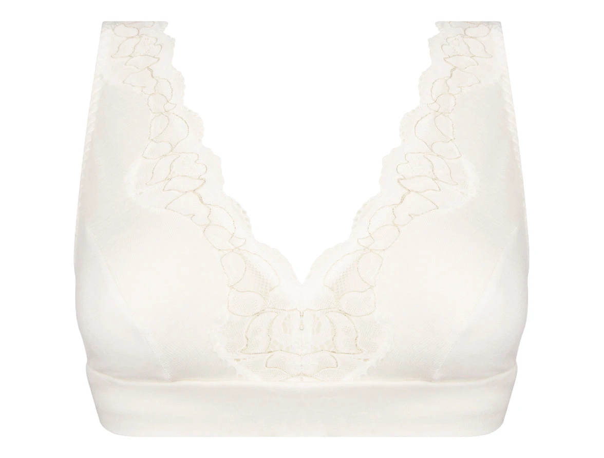 - Brassière tout en maille de bambou. Incrustation d’un galon de dentelle sur les décolletés devant et dos.