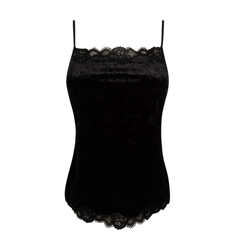 - Caraco en velours avec incrustation de dentelle au décolleté et en bas de corps.