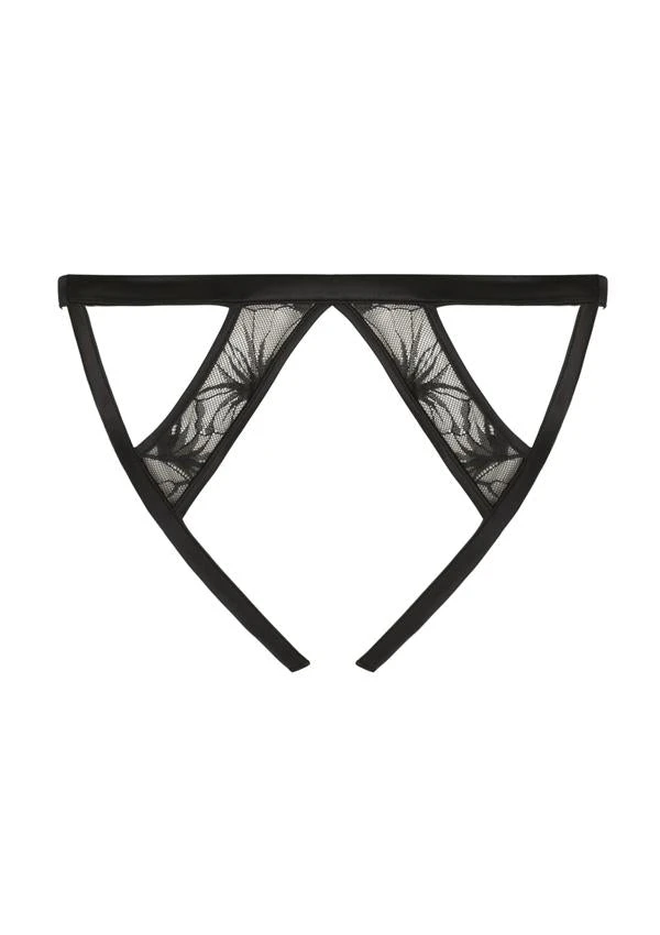 Devant en dentelle, avec incrustation de satin graphique, ouverte sur le dos, fesses soulignées avec deux bandes de dentelle.