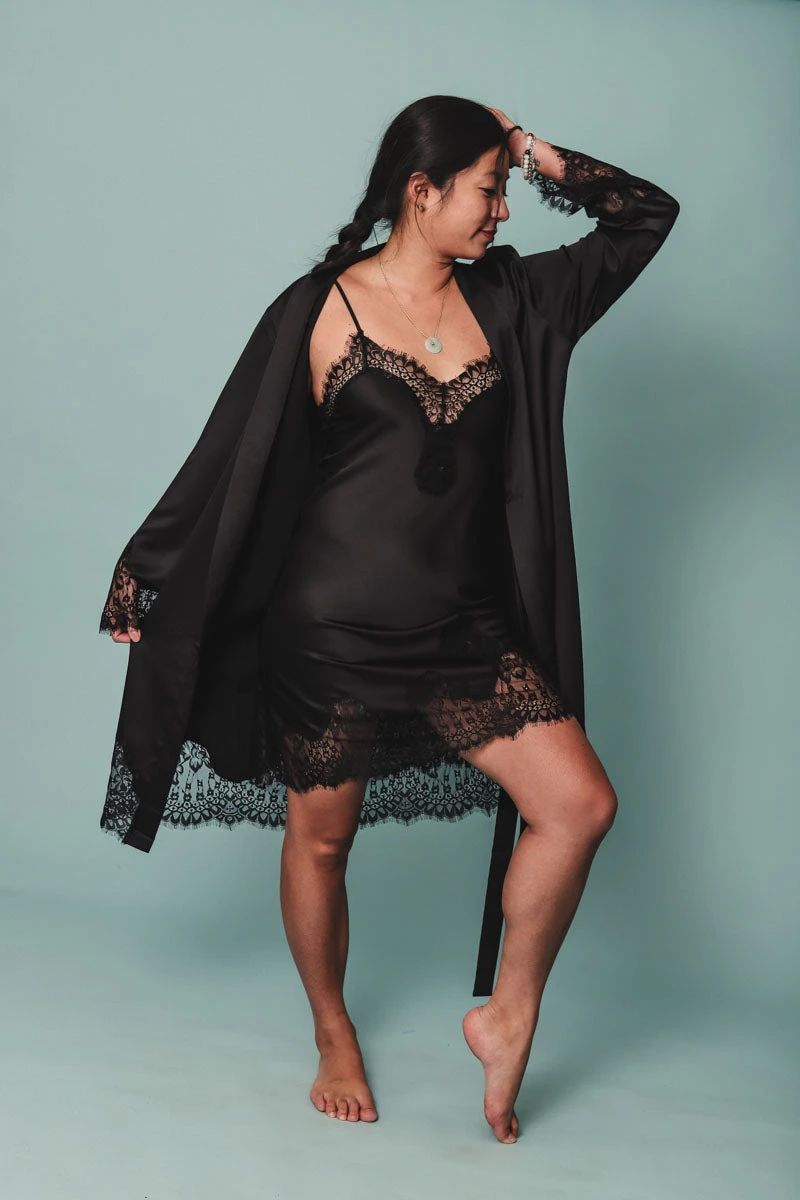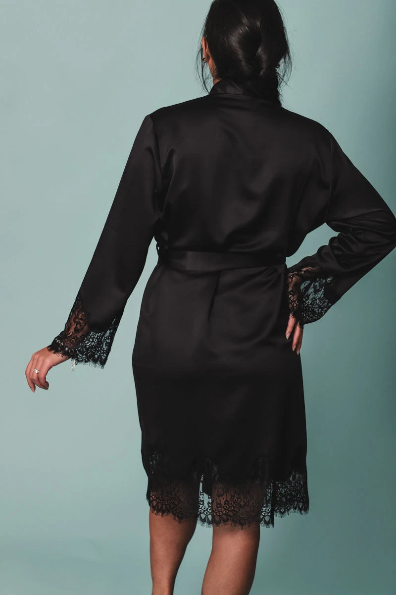 Kimono ceinturé noir en satin de la marque de lingerie Pastunette