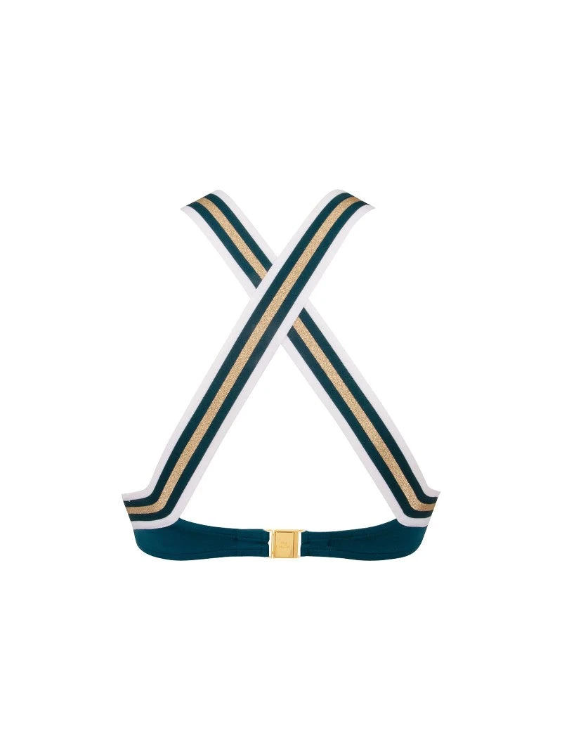 - Un élastique graphique aux touches cuivrées souligne la silhouette sous la poitrine et aux bretelles.