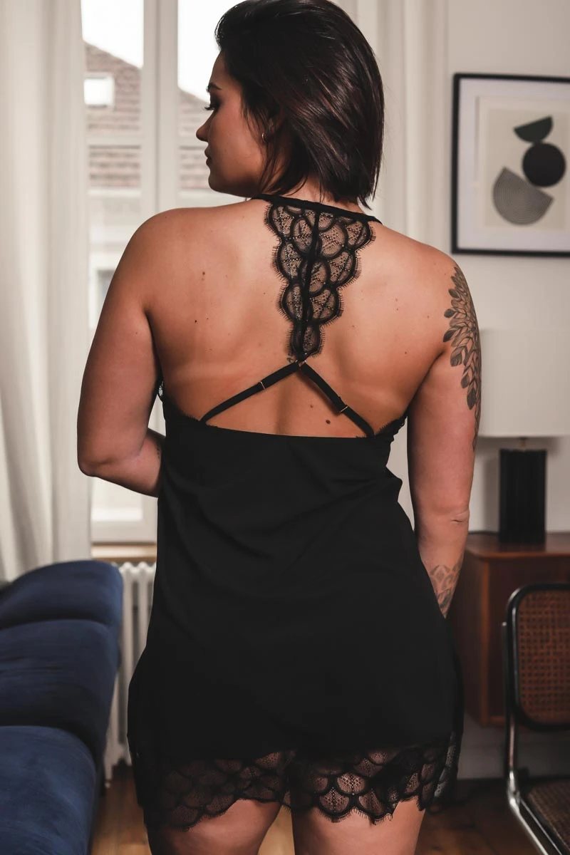 Nuisette fendue sur les côtés en crêpe tout doux. Décolleté en V souligné par des bandes de dentelle graphique noire. Fines bretelles recouvertes de crêpe.
