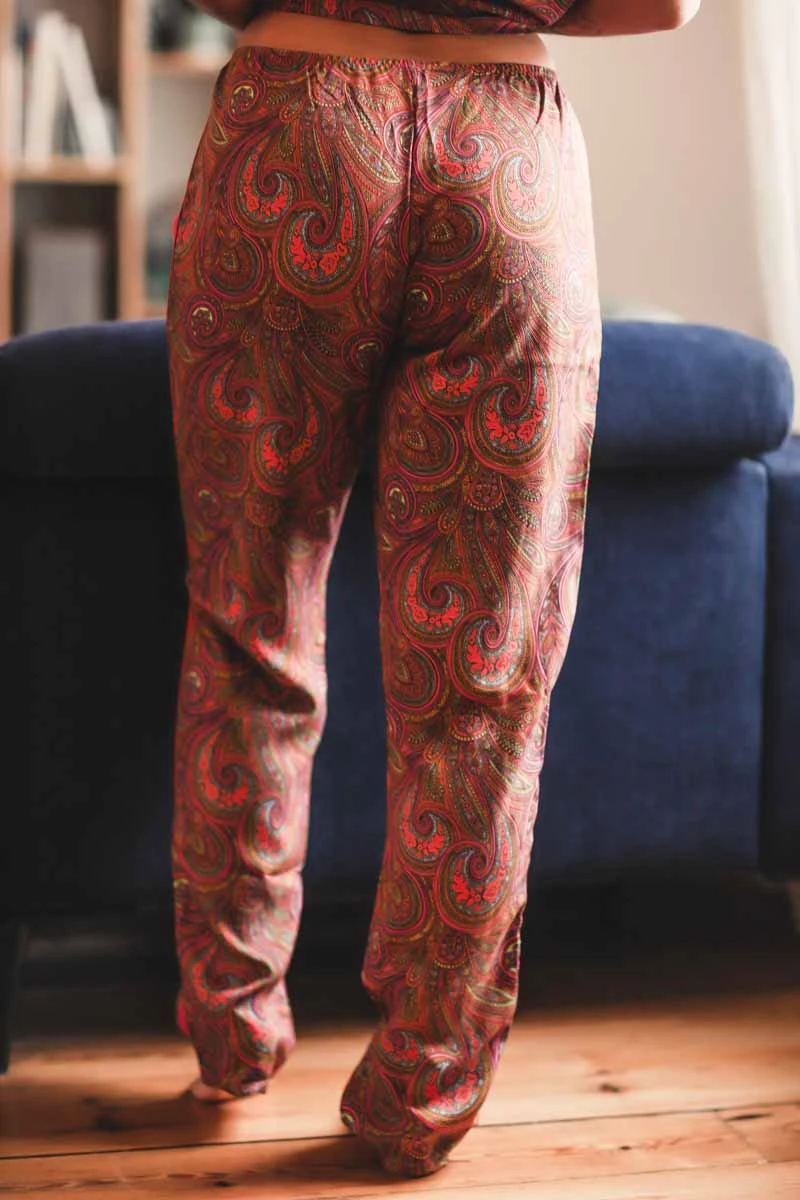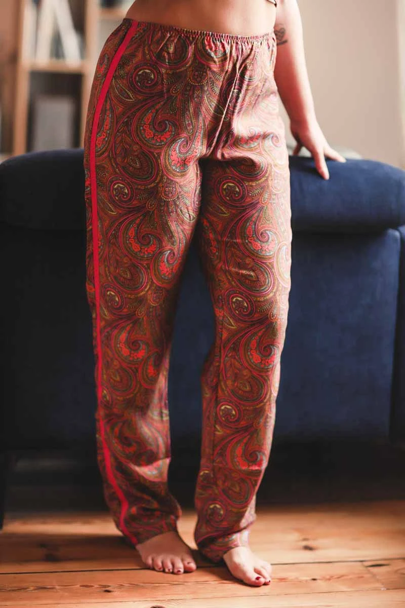 - Pantalon en tissu imprimé. Elastique fantaisie sur les côtés extérieurs des jambes.
