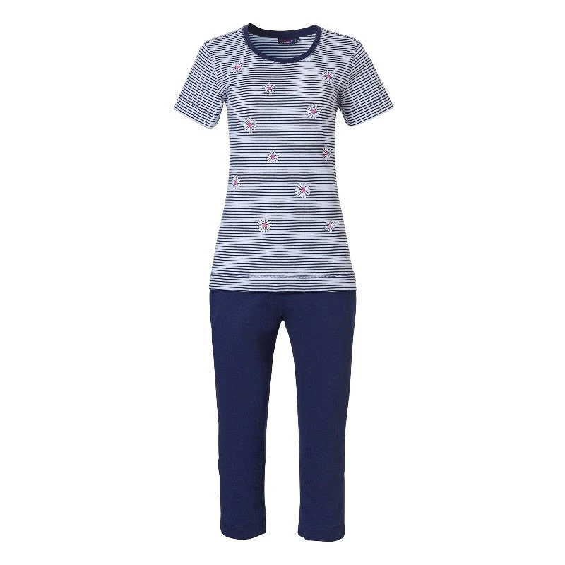 - Pyjama pantacourt à manches courtes rayé bleu marine et blanc à motif marguerites