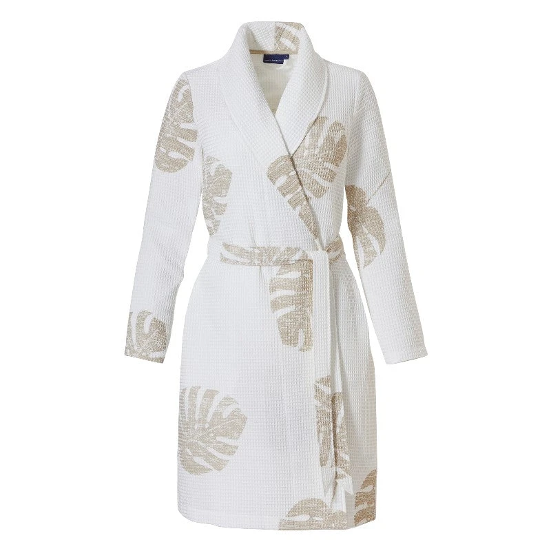 - Robe de chambre d’été blanche imprimée feuilles beiges