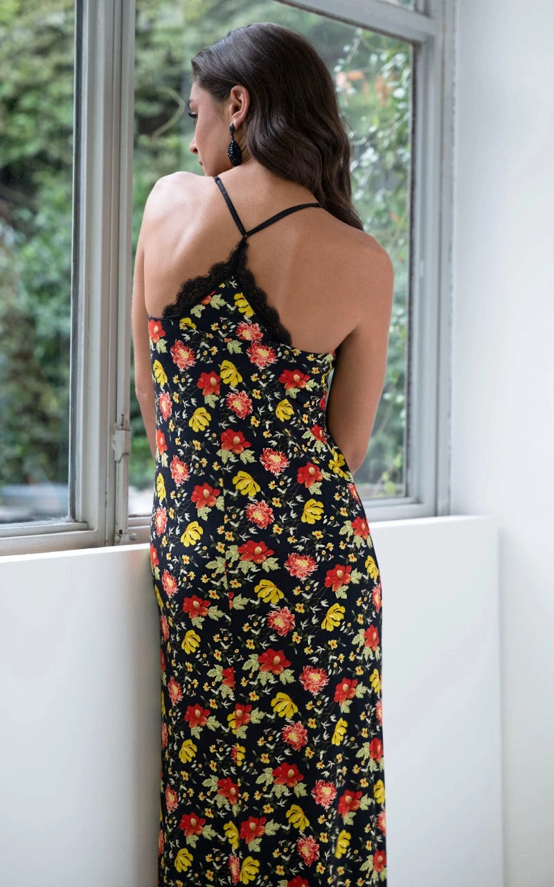 - Nuit longue en maille imprimée avec incrustation de dentelle sur les décolletés devant et dos.