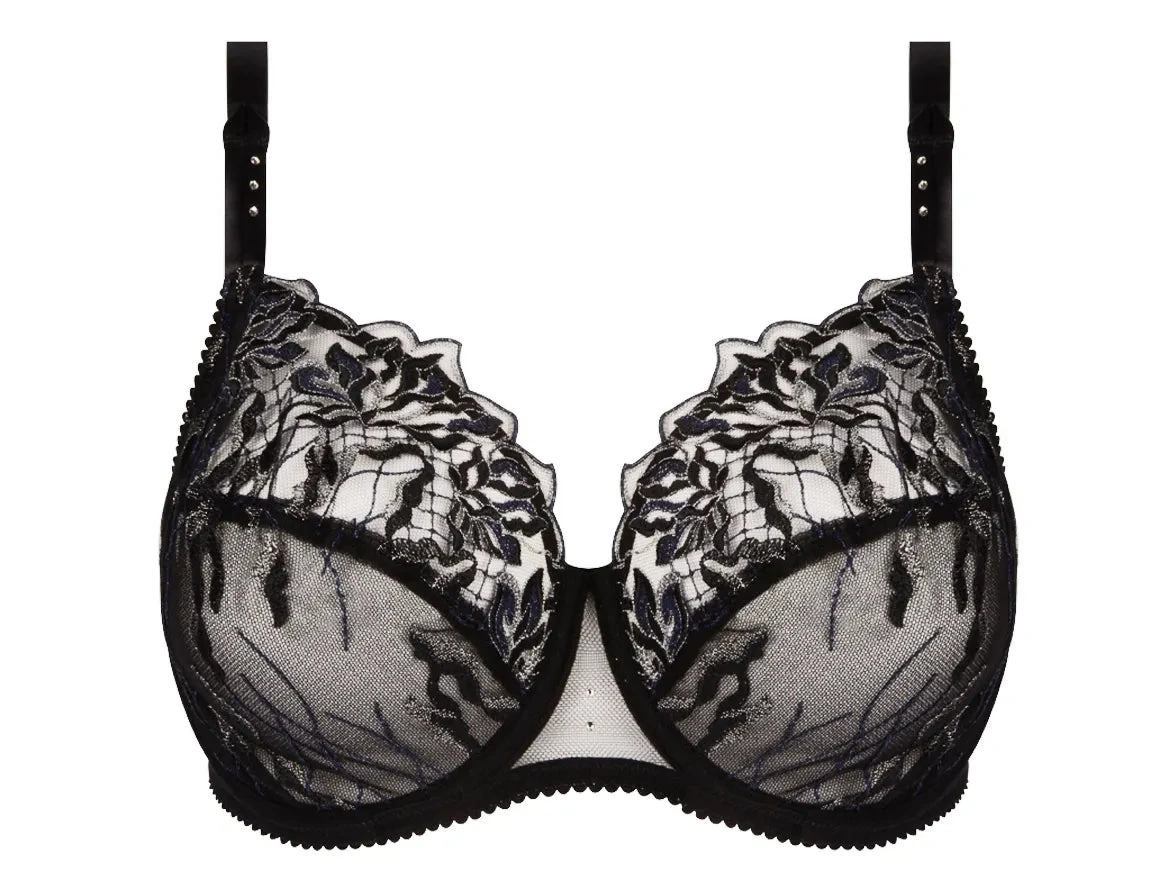 - Bonnets en broderie multifils scintillant sur tulle invisible, festonné au décolleté . L’entre-gorge joue l’invisiblilité avec un tulle tout en transparence .