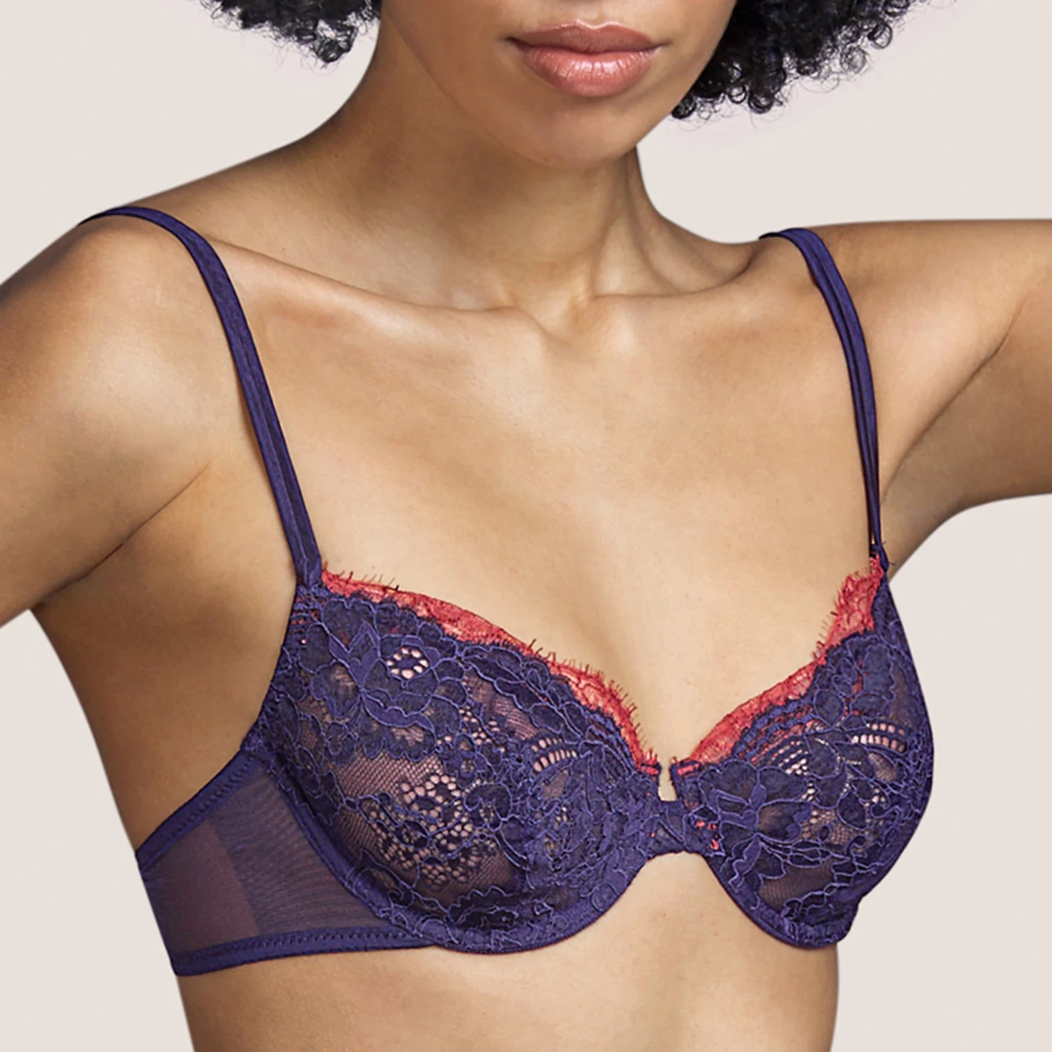 Soutien-gorge emboîtant à armatures sans rembourrage. La riche dentelle élastique apporte style et raffinement au quotidien. Les armatures positionnent la poitrine de façon avantageuse et féminine. L’utilisation des meilleures matières permet d’allier confort et esthétique Evening Blue est une alternative élégante au noir. Il est associé à un ton cuivré.