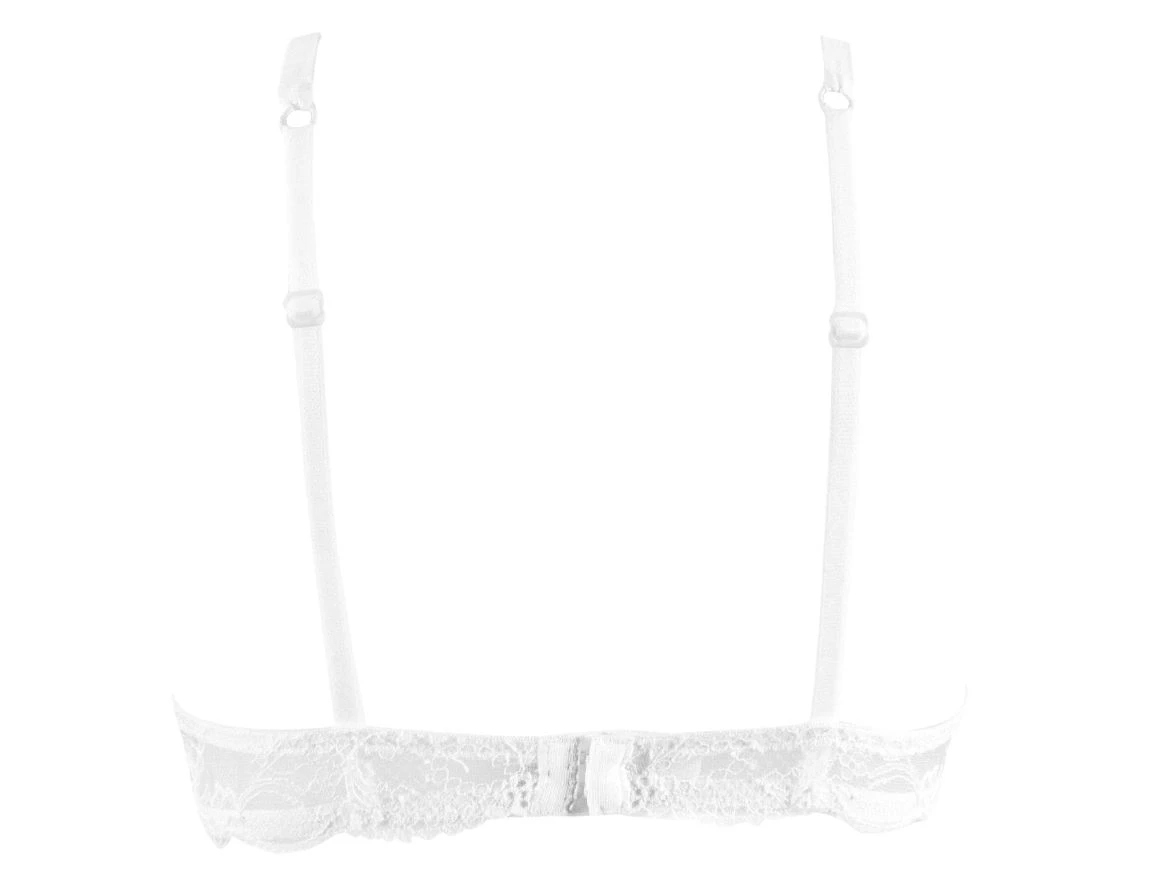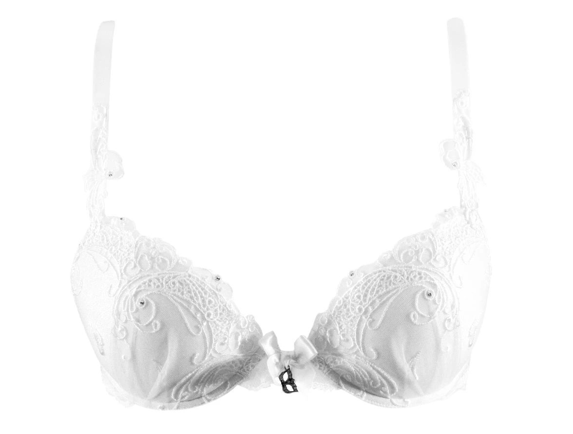 Soutien-gorge push-up à armature réalisé en dentelle de Calais. Cette forme offre un superbe décolleté, permet de rapprocher la poitrine. Bonnets brodés avec incrustation de guipure et strass. Délicat nœud de satin et masque avec strass Swarovski situés à l’entre-seins.
