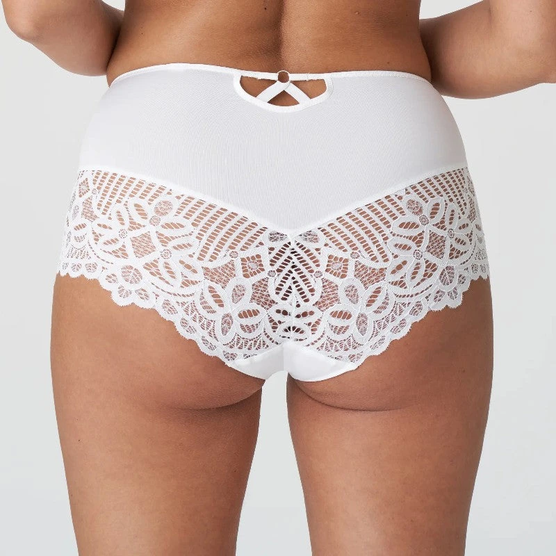 Une culotte taille haute affichant l’échancrure sensuelle d’un hotpants. Une superbe dentelle vient sublimer les hanches ! Scintillantes comme le soleil en été et parfaites comme lingerie de mariée ou de fête : des parures féminines en dentelle blanche.